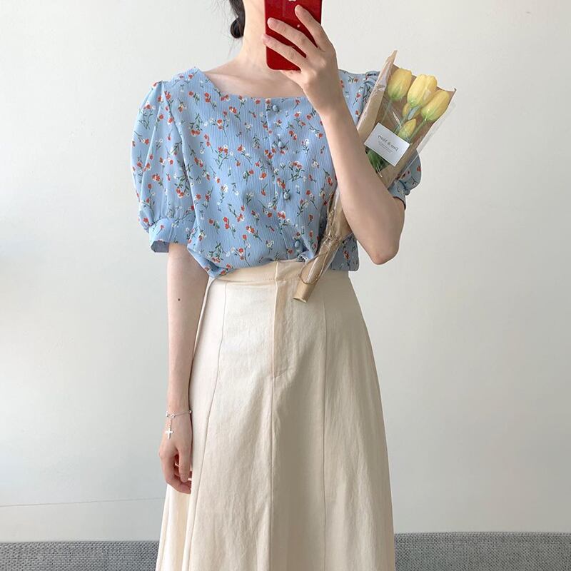 新品 スリーブ花柄シャツブラウス♥カワイイ♥Aラインスカート ロング スウィート スクウェア ⦿韓国 オルチャン K-pop アイドル ジャケット スーツ ワンピース カーディガン ニット フーディー トレーナー キャミソール スカート シャツ ブラウス 5A2033700