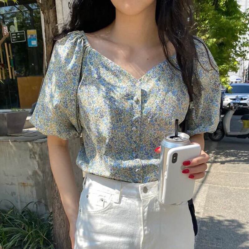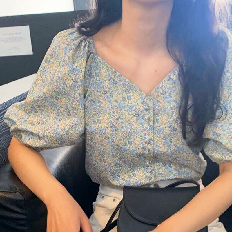 新品 スタンダード花柄♥カワイイ♥Vネックスリーブシャツブラウス レトロ ⦿韓国 オルチャン K-pop アイドル ジャケット スーツ ワンピース カーディガン ニット フーディー トレーナー キャミソール スカート シャツ ブラウス 5A7679819