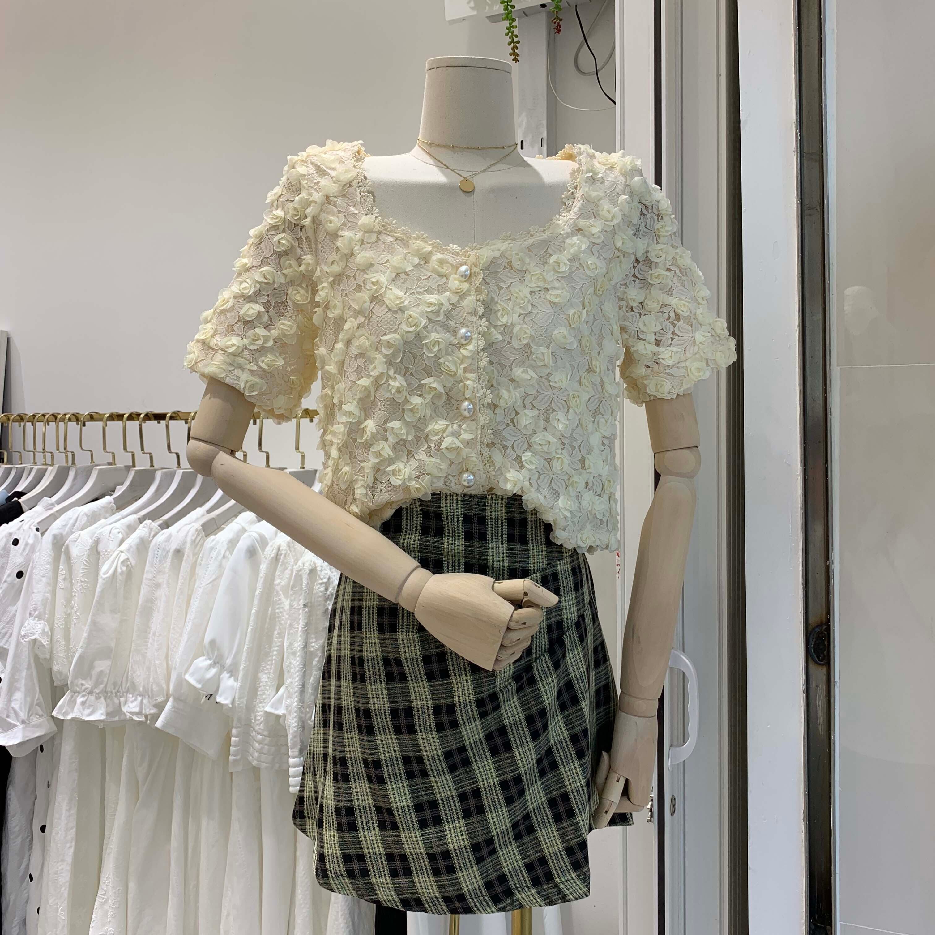 新品 サマーレースジャカード♡半袖スリーブシングルパールボタンシャツブラウス ショート 夏物 真珠 ⦿韓国 オルチャン K-pop アイドル ジャケット スーツ ワンピース カーディガン ニット フーディー トレーナー キャミソール スカート シャツ ブラウス 5B0789416 | K clothig adult