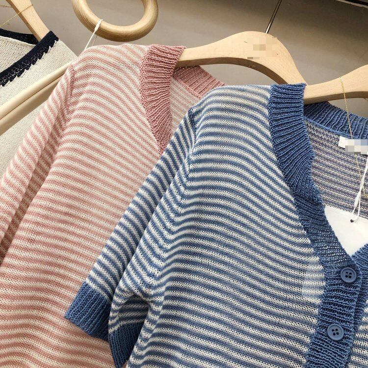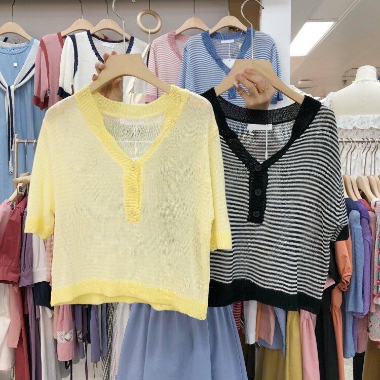 新品 カラーストライプVネックショートトップス スウィート シルク ピュア ⦿韓国 オルチャン K-pop アイドル ジャケット スーツ ワンピース カーディガン ニット フーディー トレーナー キャミソール スカート シャツ ブラウス 5B4572897