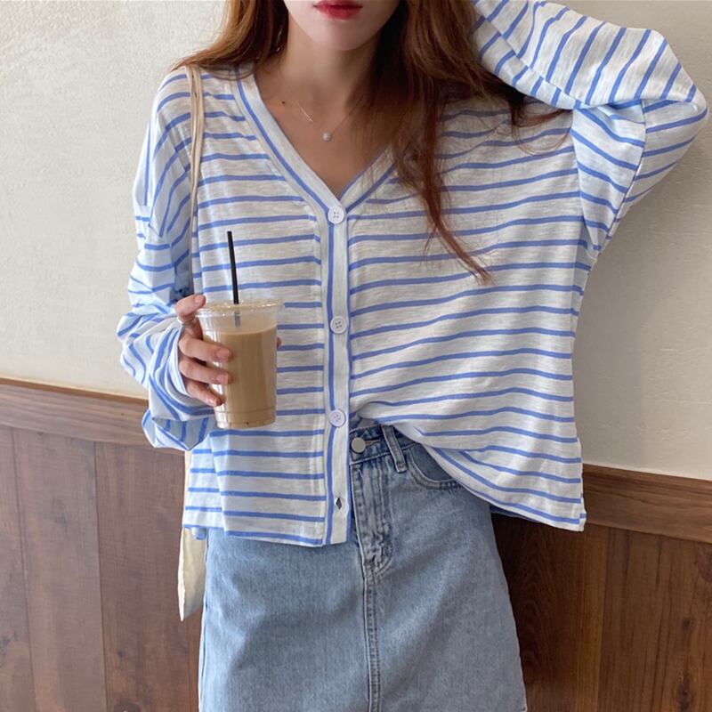 新品 カジュアル♡Vネック♥カワイイ♥シャツブラウスストライプ大人女子☆ ロング ⦿韓国 オルチャン K-pop アイドル ジャケット スーツ ワンピース カーディガン ニット フーディー トレーナー キャミソール スカート シャツ ブラウス 5A7264518