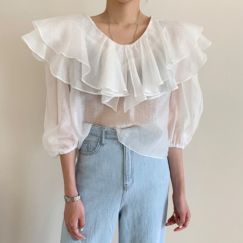 新品 Vネック♥カワイイ♥ラッフルスリーブシャツブラウス スウィート ステッチ ⦿韓国 オルチャン K-pop アイドル ジャケット スーツ ワンピース カーディガン ニット フーディー トレーナー キャミソール スカート シャツ ブラウス 5A8054209
