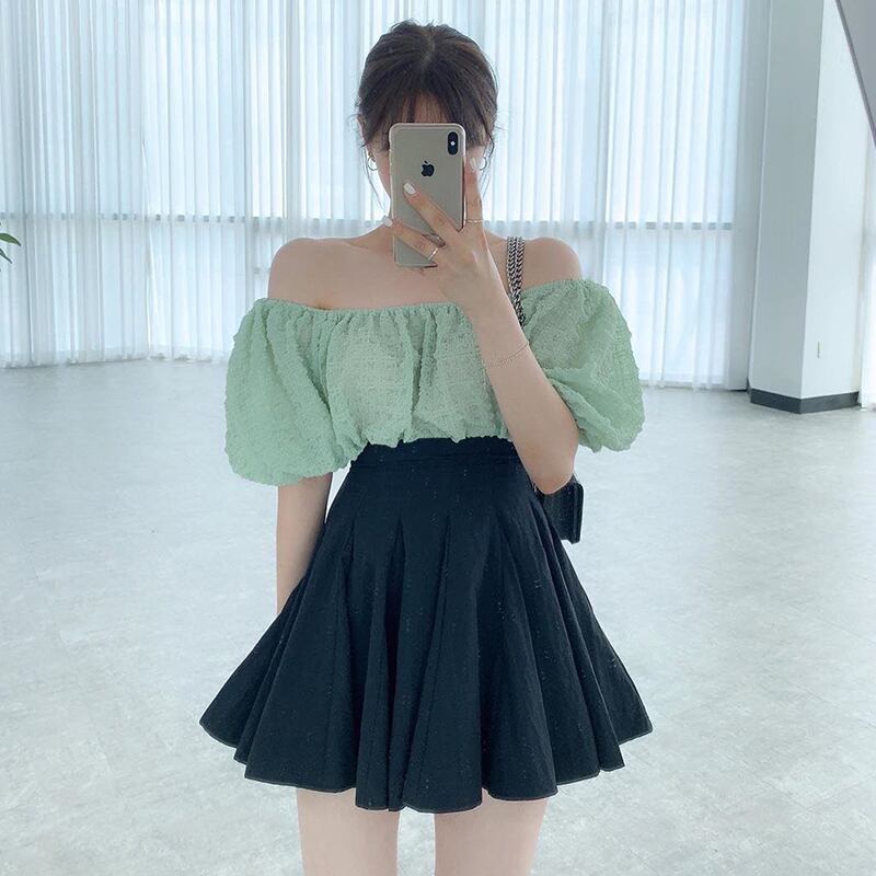 新品 ストラップレスプリーツスリーブシャツブラウスハイウェストAラインスカート ⦿韓国 オルチャン K-pop アイドル ジャケット スーツ ワンピース カーディガン ニット フーディー トレーナー キャミソール スカート シャツ ブラウス 5A7100799 | K clothig adult