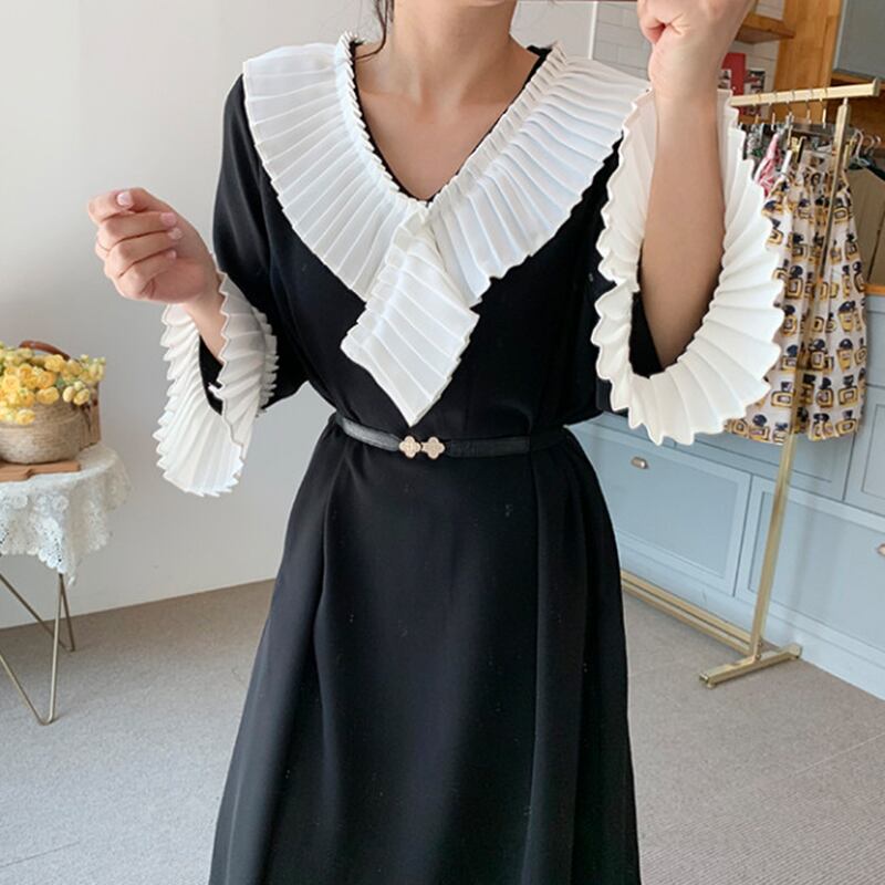 新品 ♡Vネックプリーツブラック白♥カワイイ♥膝丈 ひざ丈スリーブ ホワイト ベルスリーブ ステッチ ⦿韓国 オルチャン K-pop アイドル ジャケット スーツ ワンピース カーディガン ニット フーディー トレーナー キャミソール スカート シャツ ブラウス 5A1038756