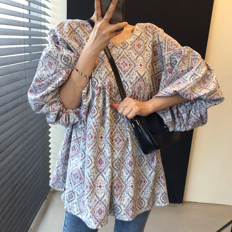 新品 スタンダードエスニック♡花柄♥カワイイ♥Vネックスリーブシャツブラウス レトロ ⦿韓国 オルチャン K-pop アイドル ジャケット スーツ ワンピース カーディガン ニット フーディー トレーナー キャミソール スカート シャツ ブラウス 5A6299749 | K clothig adult