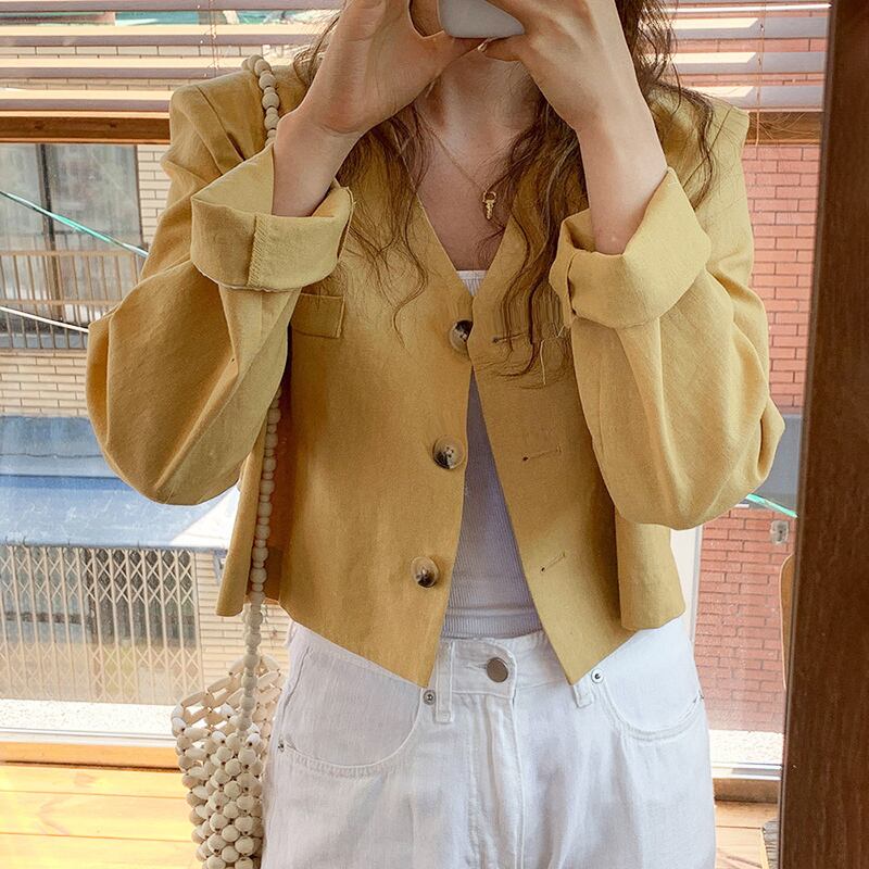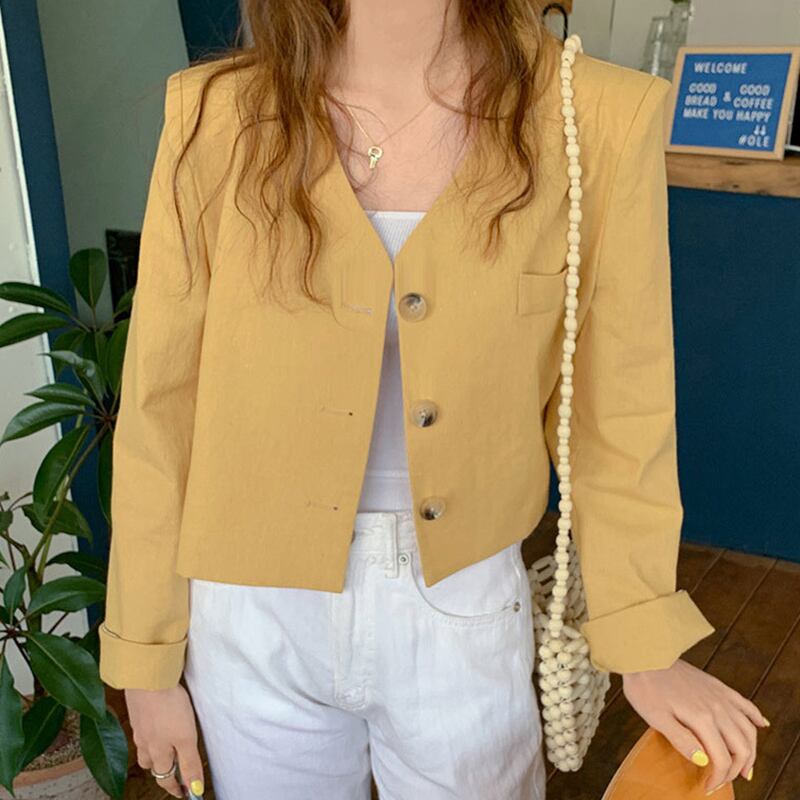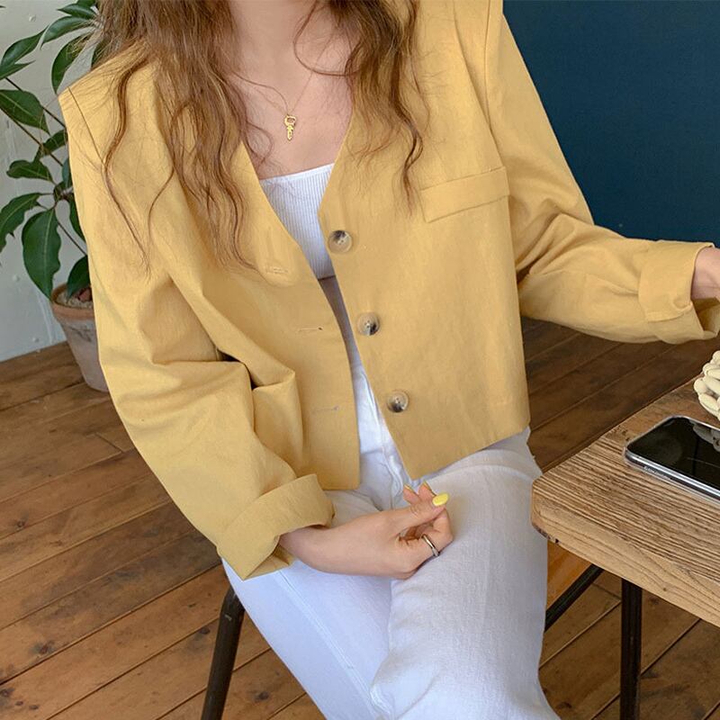 新品 スタンダードイエロー白Vネックショートジャケット 大人女子☆ ホワイト コットン レトロ ⦿韓国 オルチャン K-pop アイドル ジャケット スーツ ワンピース カーディガン ニット フーディー トレーナー キャミソール スカート シャツ ブラウス 5A0209397