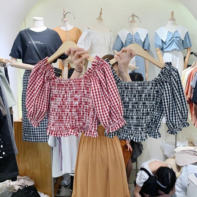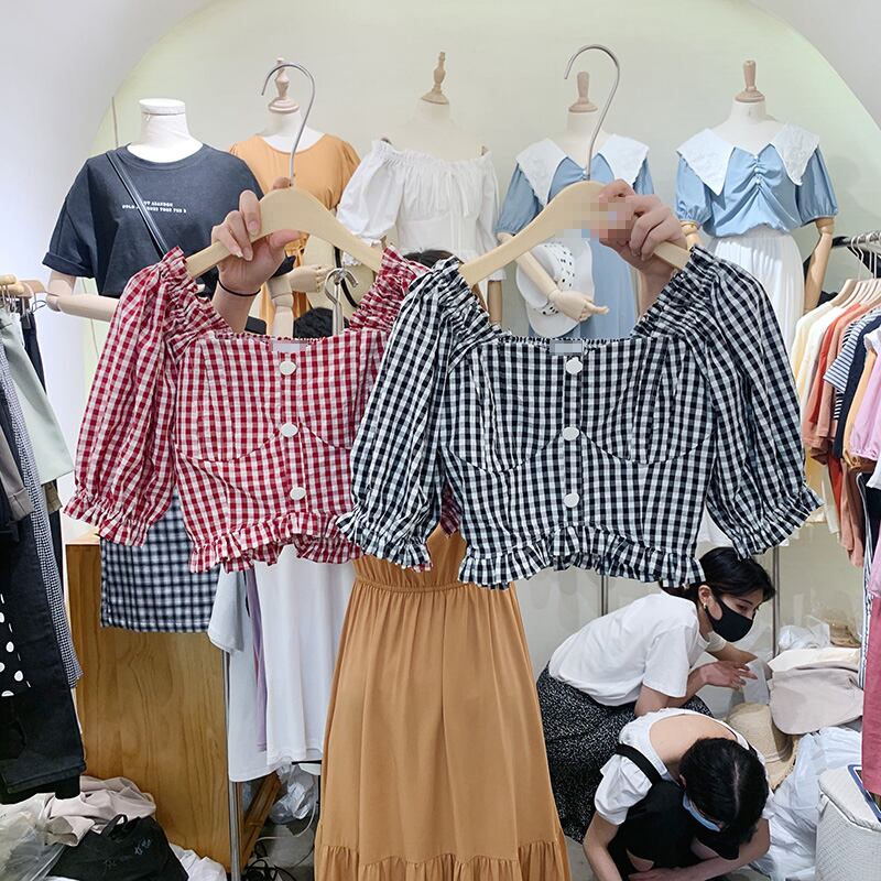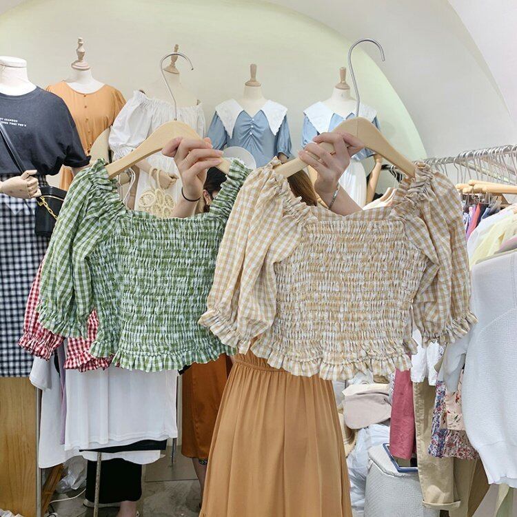 新品 チェック柄シャツブラウス大人女子☆ショートストレッチプルオーバー コットン エラスティック 伸縮 スクウェア ⦿韓国 オルチャン K-pop アイドル ジャケット スーツ ワンピース カーディガン ニット フーディー トレーナー キャミソール スカート シャツ ブラウス 5B3814737