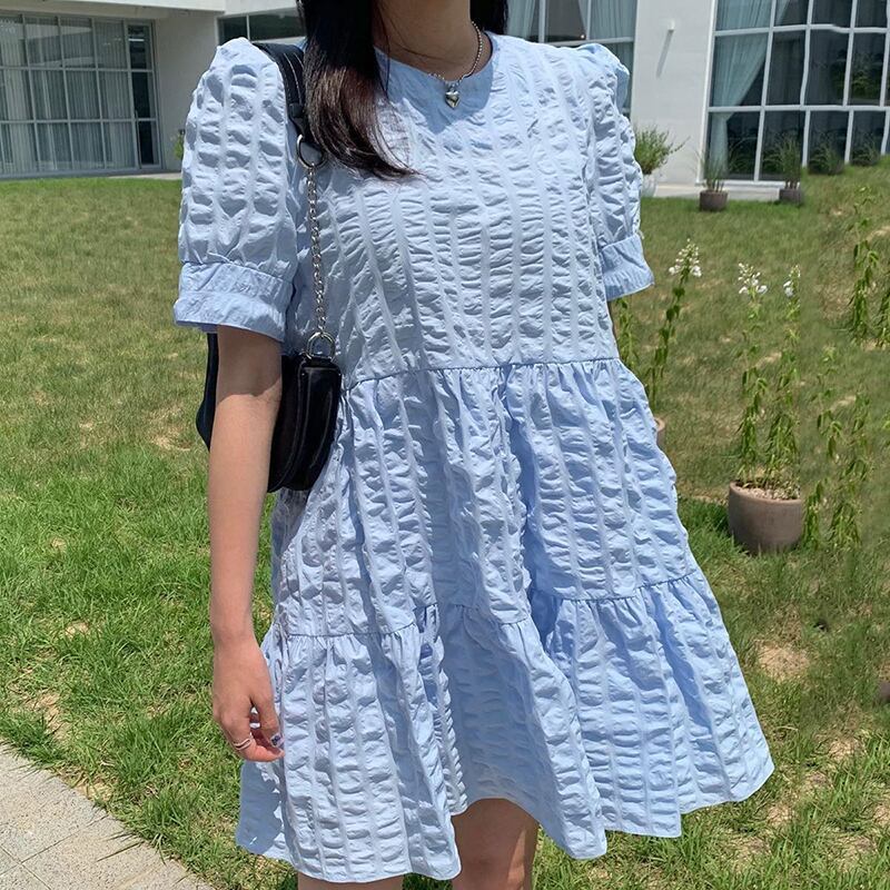 新品 ブルーラウンドネックプリーツスリーブスカート ⦿韓国 オルチャン K-pop アイドル ジャケット スーツ ワンピース カーディガン ニット フーディー トレーナー キャミソール スカート シャツ ブラウス 5A0547124