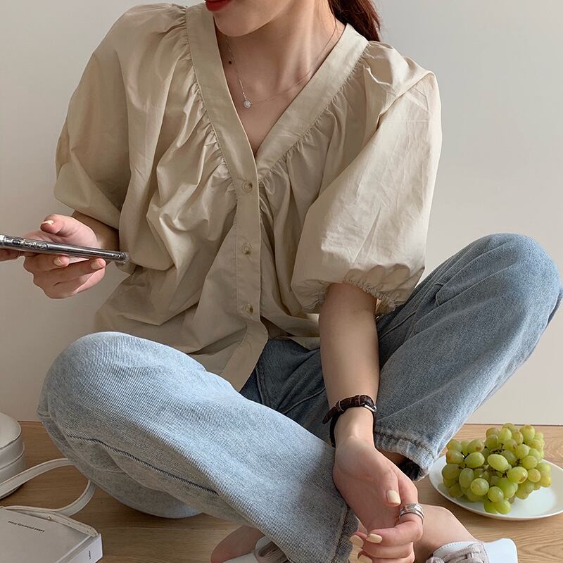 新品 ミニマリストVネックプリーツスリーブシャツブラウス大人女子☆ ⦿韓国 オルチャン K-pop アイドル ジャケット スーツ ワンピース カーディガン ニット フーディー トレーナー キャミソール スカート シャツ ブラウス 5A7949326