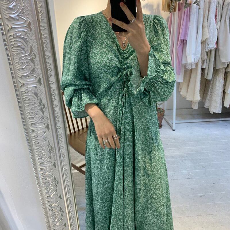 新品 グリーン♥カワイイ♥Vネックギャザーロング大人女子☆ 花柄 ⦿韓国 オルチャン K-pop アイドル ジャケット スーツ ワンピース カーディガン ニット フーディー トレーナー キャミソール スカート シャツ ブラウス 5A4326555