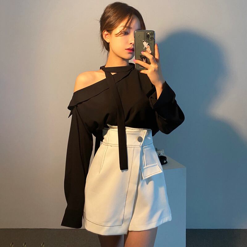 新品 シャツブラウスハイウェストトップス スカート 大人女子☆ ロング オフショルダー ステッチ ⦿韓国 オルチャン K-pop アイドル ジャケット スーツ ワンピース カーディガン ニット フーディー トレーナー キャミソール スカート シャツ ブラウス 5A8003022 | K clothig adult