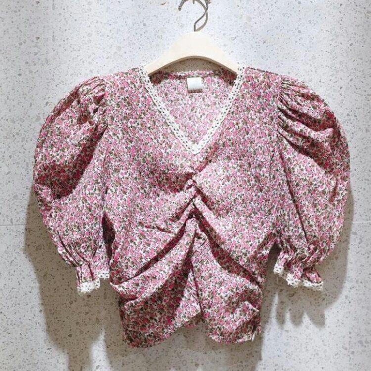 新品 サマー花柄Vネックスリーブプリーツスリム♥カワイイ♥シャツブラウス 夏物 ⦿韓国 オルチャン K-pop アイドル ジャケット スーツ ワンピース カーディガン ニット フーディー トレーナー キャミソール スカート シャツ ブラウス 5B1121635 | K clothig adult