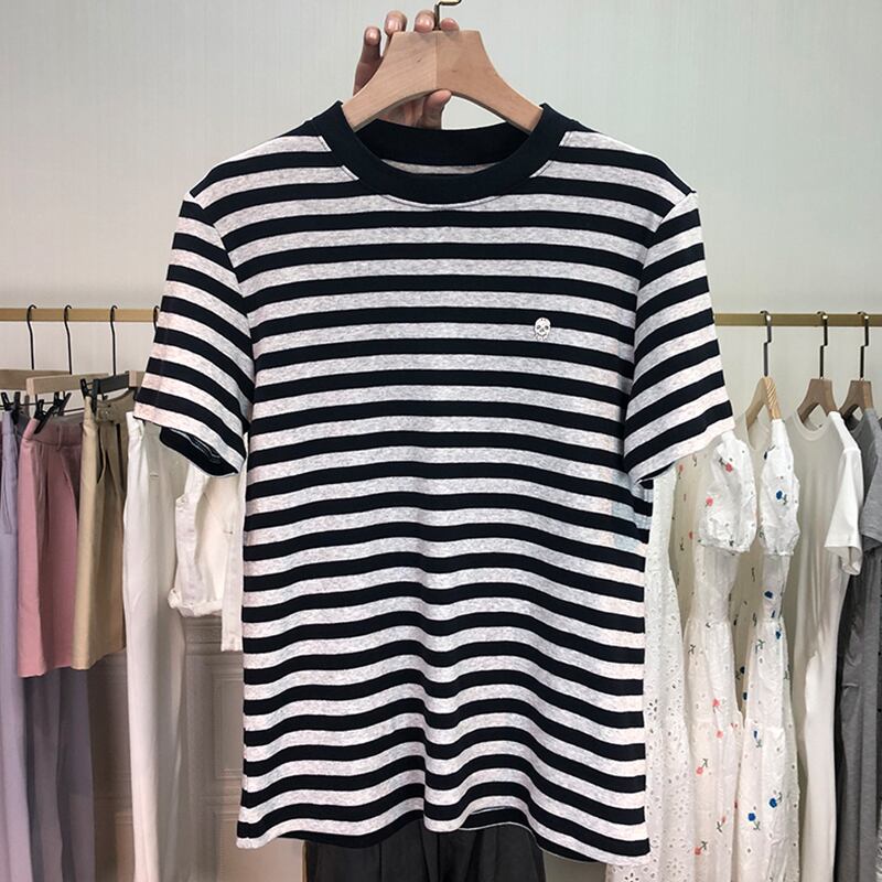 新品 ラウンドネックストライプトップス 半袖スリーブTシャツ ショート ⦿韓国 オルチャン K-pop アイドル ジャケット スーツ ワンピース カーディガン ニット フーディー トレーナー キャミソール スカート シャツ ブラウス 5B5399191