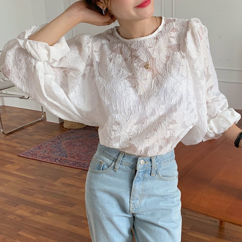 新品 ラウンドネックジャカードスリーブシャツブラウス大人女子☆ ランタンスリーブ ステッチ ⦿韓国 オルチャン K-pop アイドル ジャケット スーツ ワンピース カーディガン ニット フーディー トレーナー キャミソール スカート シャツ ブラウス 5A0987168 | K clothig adult