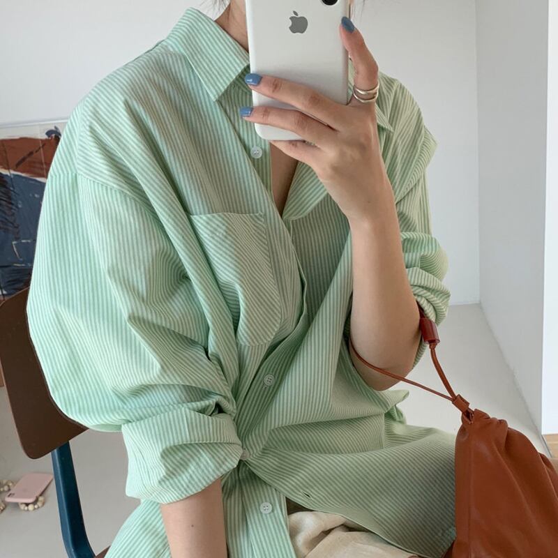 新品 ♡サイドボタン★ストライプシャツブラウストップス 大人女子☆ ロング ⦿韓国 オルチャン K-pop アイドル ジャケット スーツ ワンピース カーディガン ニット フーディー トレーナー キャミソール スカート シャツ ブラウス 5A2814984 | K clothig adult