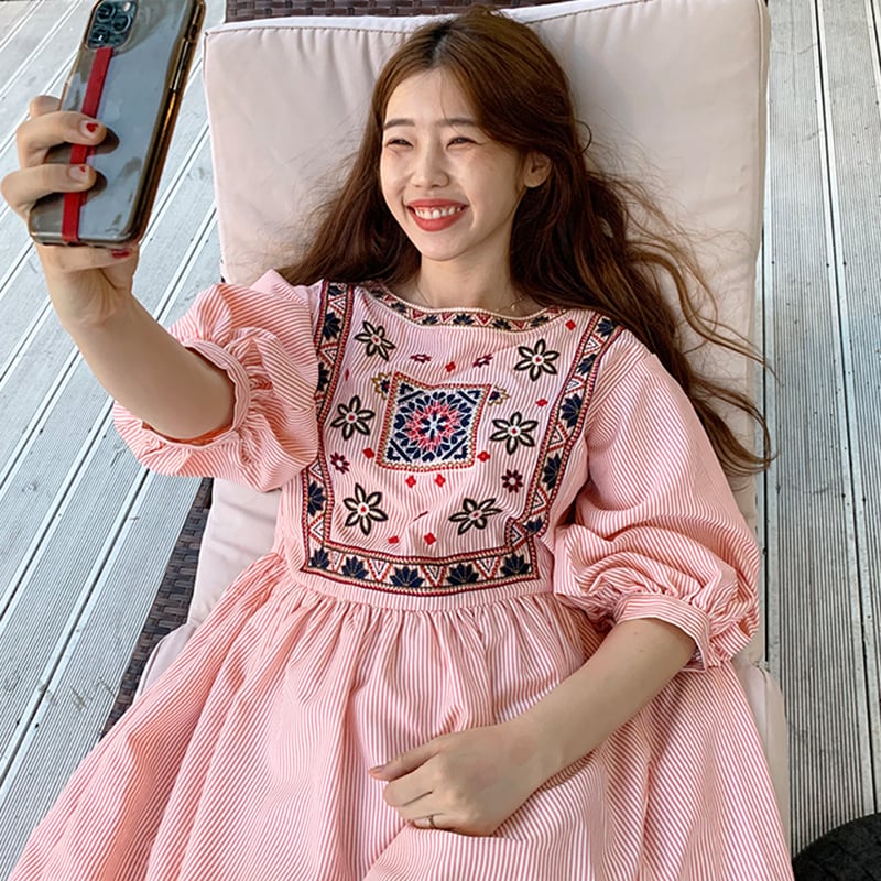 新品 スタンダード自然派ラウンドネック刺繍スリーブストライプロングスカート ランタンスリーブ レトロ ⦿韓国 オルチャン K-pop アイドル ジャケット スーツ ワンピース カーディガン ニット フーディー トレーナー キャミソール スカート シャツ ブラウス 5A9603402