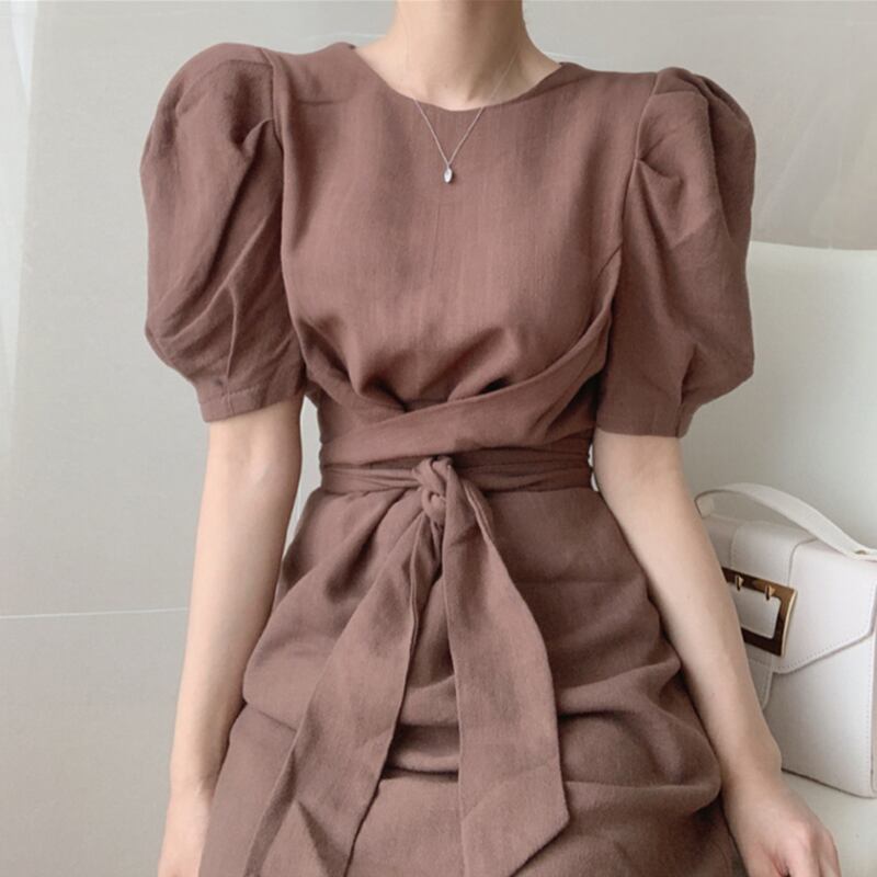 KOREAラウンドネックハイウエストクロスストラップワンピ★ソリッドカラースリーブロング レトロ ⦿韓国 オルチャン K-pop アイドル ジャケット スーツ ワンピース カーディガン ニット フーディー トレーナー キャミソール スカート シャツ ブラウス 5A5637039 | K clothig adult