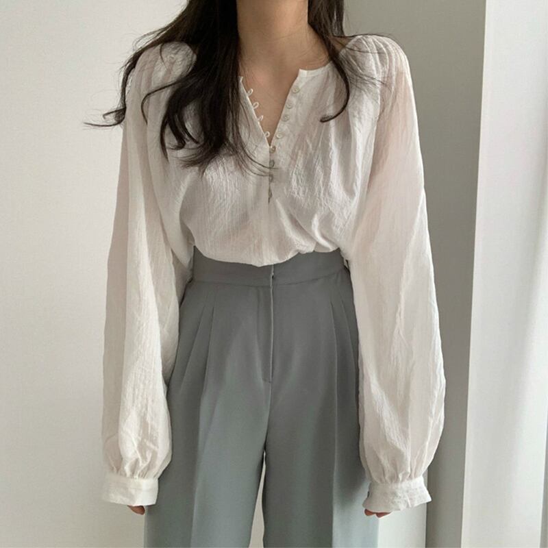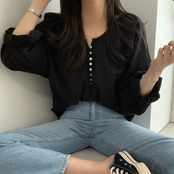 新品 ラウンドネックボタン♥カワイイ♥シャツブラウス大人女子☆ ロング ⦿韓国 オルチャン K-pop アイドル ジャケット スーツ ワンピース カーディガン ニット フーディー トレーナー キャミソール スカート シャツ ブラウス 5A5940511 | K clothig adult