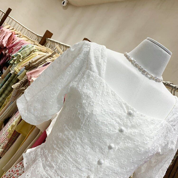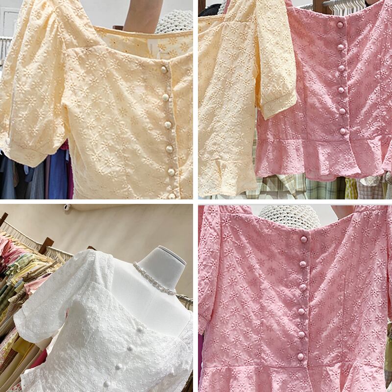 新品 ボタン刺繍レーススリーブシャツブラウス スウィート スクウェア ⦿韓国 オルチャン K-pop アイドル ジャケット スーツ ワンピース カーディガン ニット フーディー トレーナー キャミソール スカート シャツ ブラウス 5B4699771