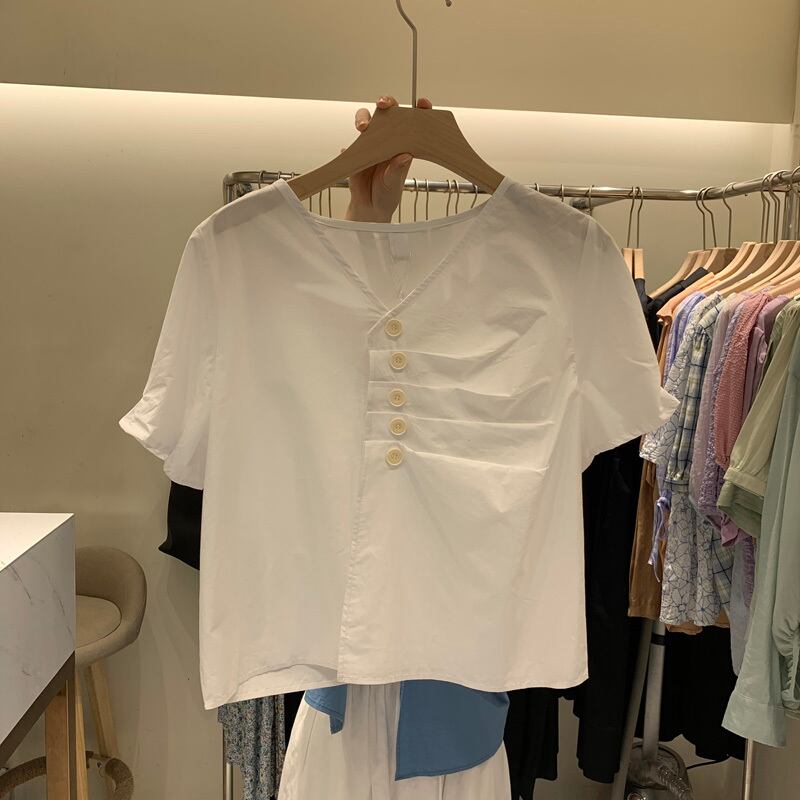 新品 サマースリーブソリッド シャツブラウス大人女子☆ コットン 夏物 ソリッドカラー ⦿韓国 オルチャン K-pop アイドル ジャケット スーツ ワンピース カーディガン ニット フーディー トレーナー キャミソール スカート シャツ ブラウス 5B7799783