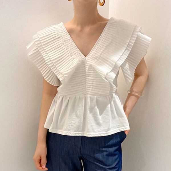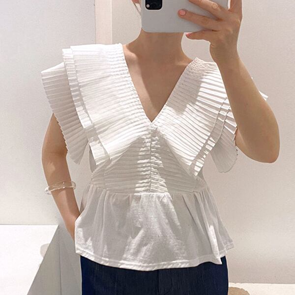 新品 Vネック♥カワイイ♥プリーツショートシャツブラウストップス 大人女子☆ ステッチ ⦿韓国 オルチャン K-pop アイドル ジャケット スーツ ワンピース カーディガン ニット フーディー トレーナー キャミソール スカート シャツ ブラウス 5A2042521