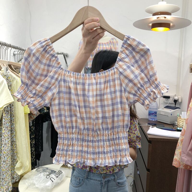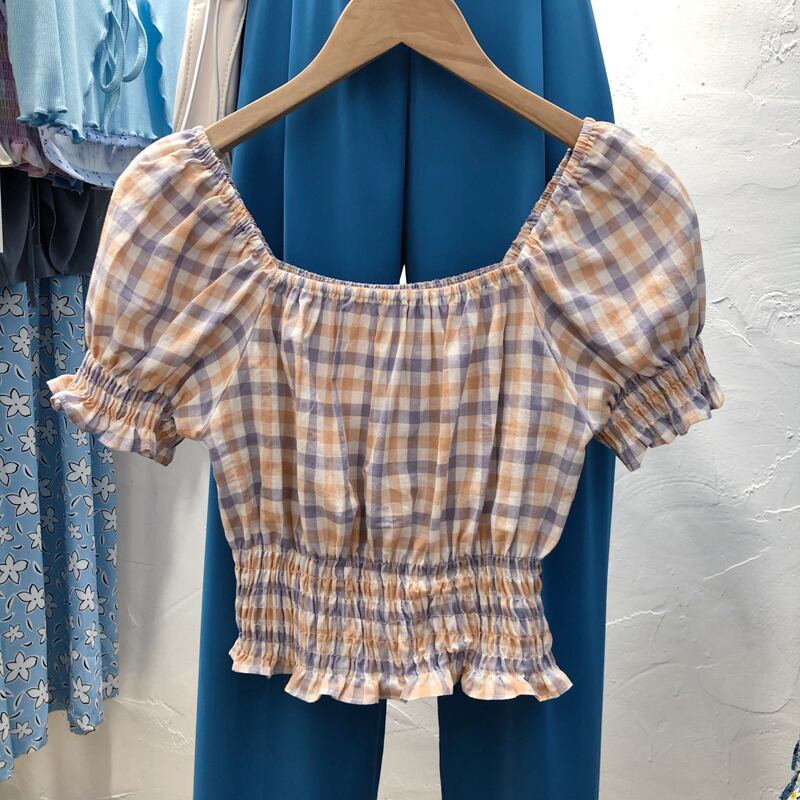 新品 サマーチェック柄カラーストレッチ★♥カワイイ♥スリーブショートトップス エラスティック 伸縮 スウィート 夏物 ⦿韓国 オルチャン K-pop アイドル ジャケット スーツ ワンピース カーディガン ニット フーディー トレーナー キャミソール スカート シャツ ブラウス 5B1631154
