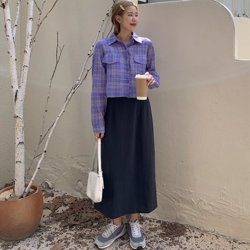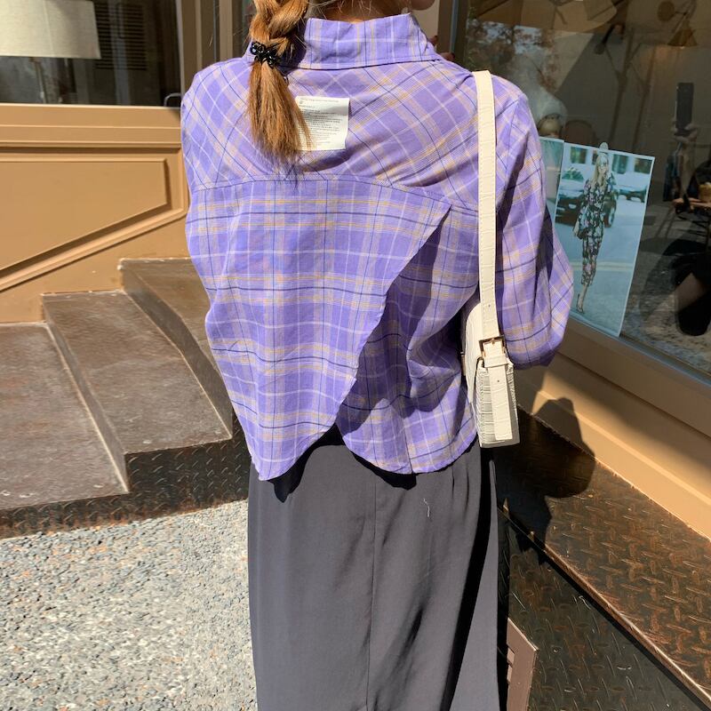 新品 ♡チェック柄バックショートシャツブラウススリットスカート パープル ⦿韓国 オルチャン K-pop アイドル ジャケット スーツ ワンピース カーディガン ニット フーディー トレーナー キャミソール スカート シャツ ブラウス 5A0943485