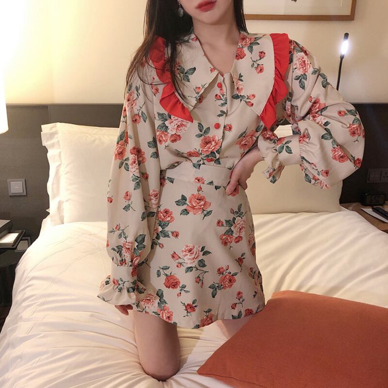 新品 ♡花柄プリント柄シャツブラウスAラインスカート レッド ⦿韓国 オルチャン K-pop アイドル ジャケット スーツ ワンピース カーディガン ニット フーディー トレーナー キャミソール スカート シャツ ブラウス 5A5143257