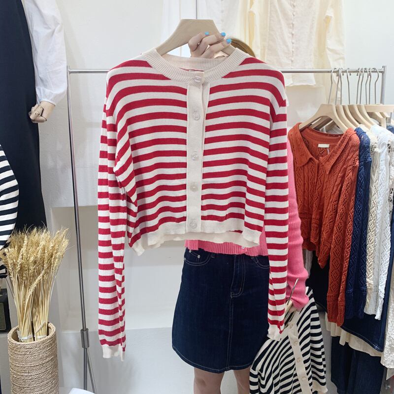 新品 ショートラウンドネックストライプニットカーディガントップス ⦿韓国 オルチャン K-pop アイドル ジャケット スーツ ワンピース カーディガン ニット フーディー トレーナー キャミソール スカート シャツ ブラウス 5B8532471