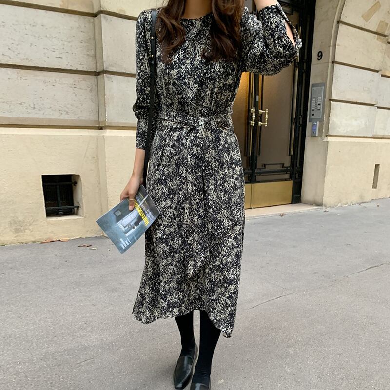 新品 ダークブラック白花柄ラウンドネック★♥カワイイ♥ロング膝丈 ひざ丈 ホワイト ⦿韓国 オルチャン K-pop アイドル ジャケット スーツ ワンピース カーディガン ニット フーディー トレーナー キャミソール スカート シャツ ブラウス 5A6219160
