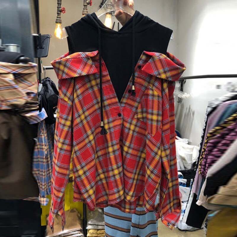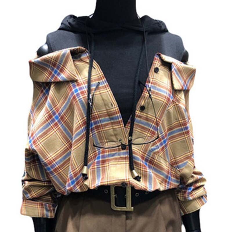 新品 カラーチェック柄フードシャツブラウス ロング オフショルダー ステッチ ⦿韓国 オルチャン K-pop アイドル ジャケット スーツ ワンピース カーディガン ニット フーディー トレーナー キャミソール スカート シャツ ブラウス 5B9164354 | K clothig adult