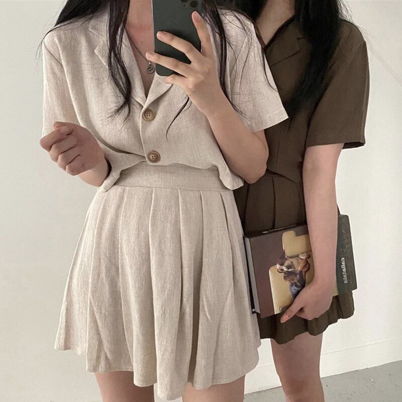 新品 ボタンソリッド カラー半袖スリーブシャツブラウスプリーツスカート ショート ソリッドカラー ⦿韓国 オルチャン K-pop アイドル ジャケット スーツ ワンピース カーディガン ニット フーディー トレーナー キャミソール スカート シャツ ブラウス 5A5025749