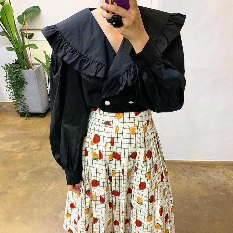 新品 スタンダードラッフルダブルブレストシャツブラウスプリント柄スカート ロング レトロ ステッチ ⦿韓国 オルチャン K-pop アイドル ジャケット スーツ ワンピース カーディガン ニット フーディー トレーナー キャミソール スカート シャツ ブラウス 5A9421724 | K clothig adult