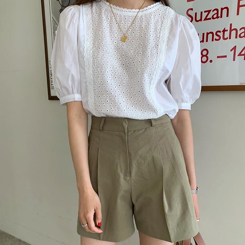 新品 ラウンドネック刺繍スリーブシャツブラウスカジュアルショートパンツ大人女子☆ ⦿韓国 オルチャン K-pop アイドル ジャケット スーツ ワンピース カーディガン ニット フーディー トレーナー キャミソール スカート シャツ ブラウス 5A7141832