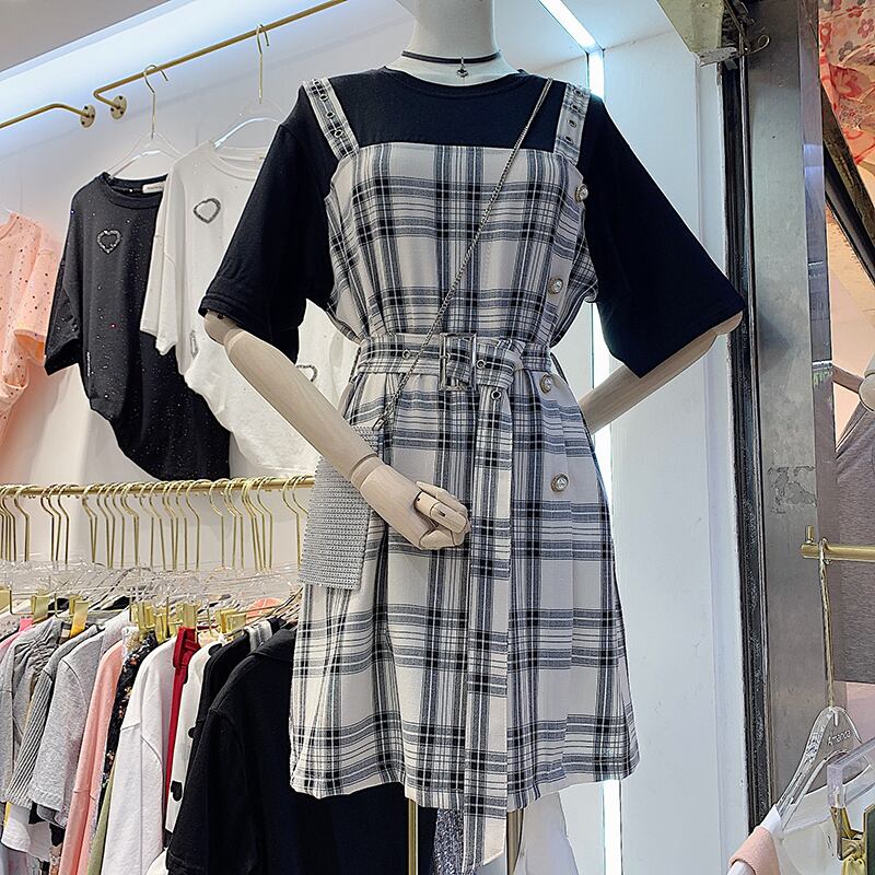 新品 ラウンドネック半袖スリーブ♥カワイイ♥チェック柄Tシャツ ワンピーススカート ショート ステッチ ⦿韓国 オルチャン K-pop アイドル ジャケット スーツ ワンピース カーディガン ニット フーディー トレーナー キャミソール スカート シャツ ブラウス 5B9753280