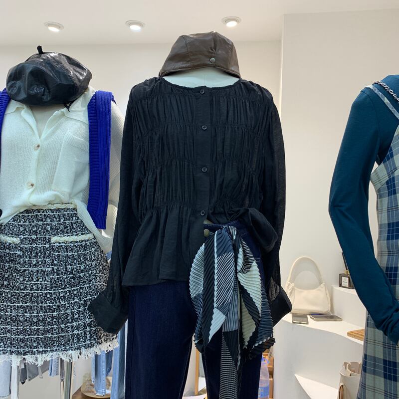 新品 ラウンドネックストレッチシャツブラウス ロング エラスティック 伸縮 ステッチ ⦿韓国 オルチャン K-pop アイドル ジャケット スーツ ワンピース カーディガン ニット フーディー トレーナー キャミソール スカート シャツ ブラウス 5B8489384