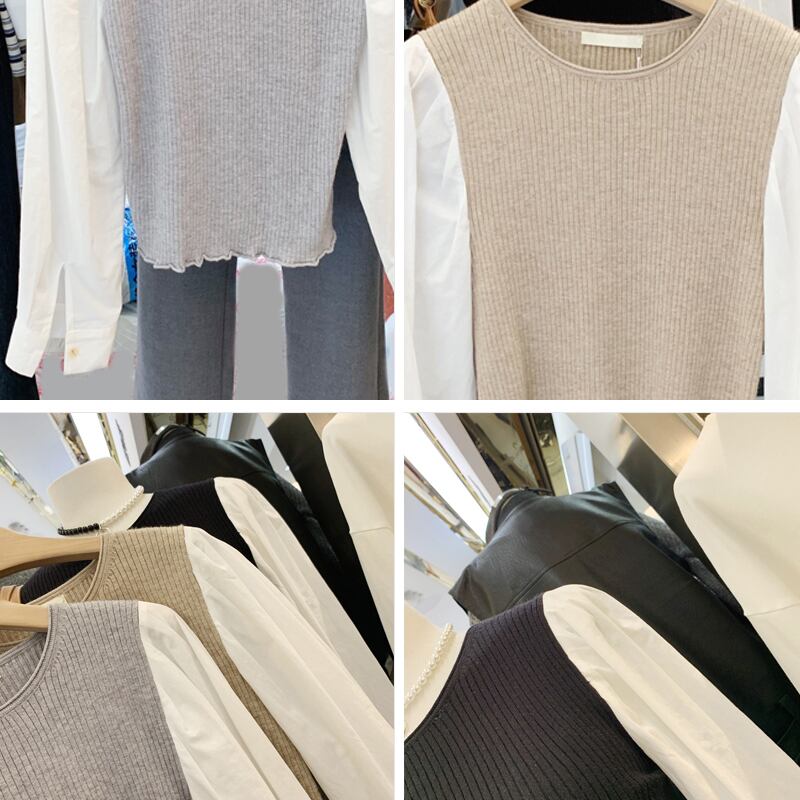 新品 ラウンドネックニットシャツブラウススリーブトップス ステッチ ⦿韓国 オルチャン K-pop アイドル ジャケット スーツ ワンピース カーディガン ニット フーディー トレーナー キャミソール スカート シャツ ブラウス 5B1152596