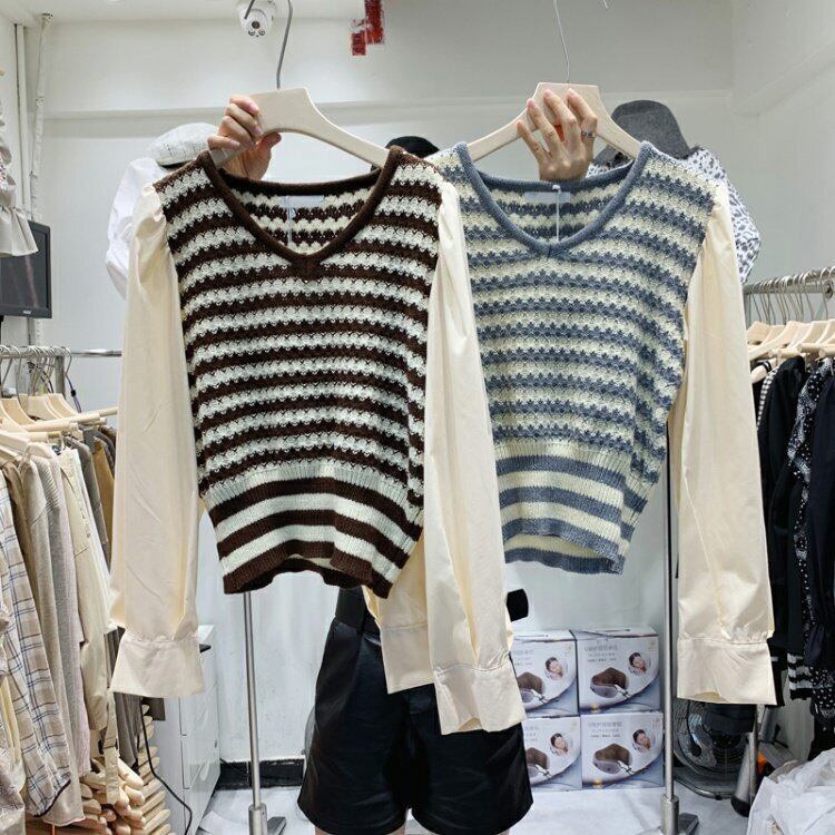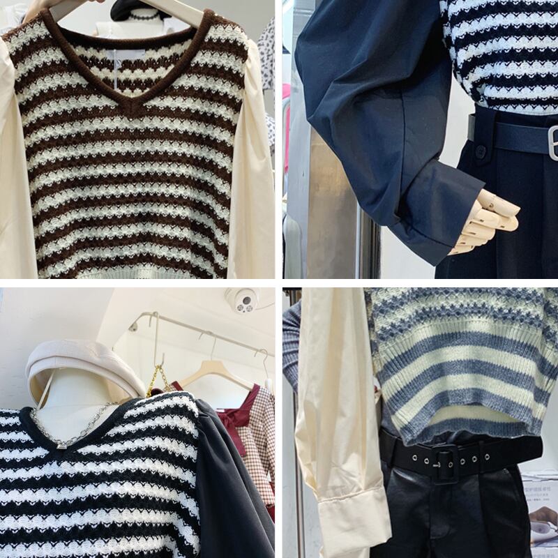 新品 オータムVネックストライプセーター シャツブラウス 秋物 ⦿韓国 オルチャン K-pop アイドル ジャケット スーツ ワンピース カーディガン ニット フーディー トレーナー キャミソール スカート シャツ ブラウス 5B5602060