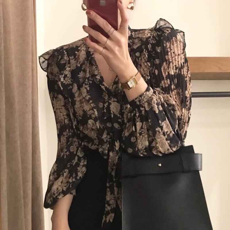 新品 スタンダードVネックリボンプリーツスリーブ花柄シャツブラウス大人女子☆ ランタンスリーブ レトロ ⦿韓国 オルチャン K-pop アイドル ジャケット スーツ ワンピース カーディガン ニット フーディー トレーナー キャミソール スカート シャツ ブラウス 5A8746843 | K clothig adult