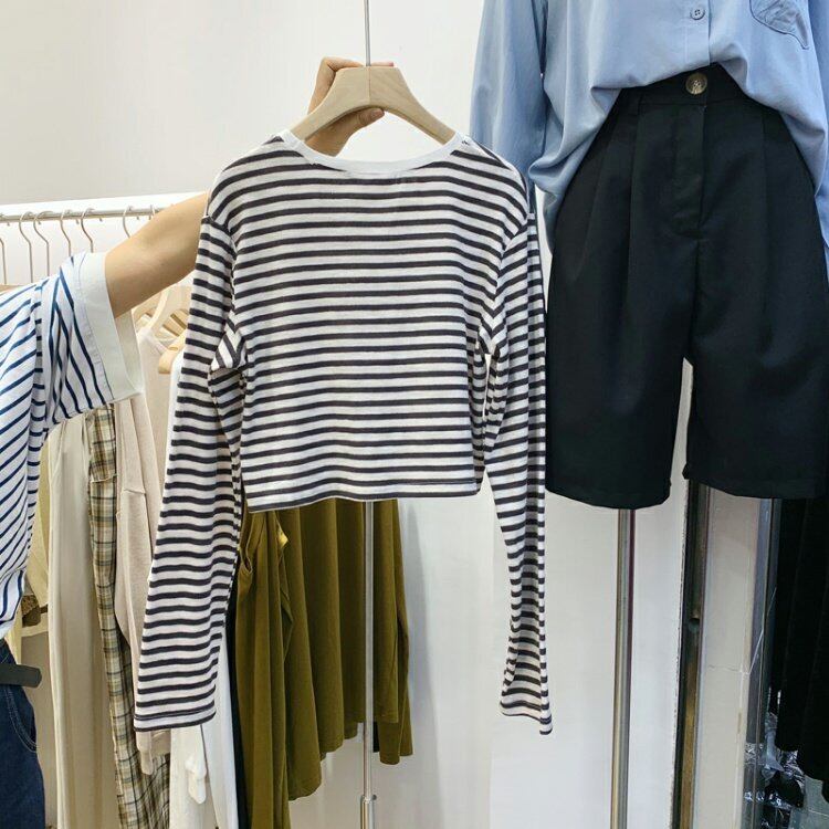 新品 オータムラウンドネックショートストライププルオーバー 長袖スリーブTシャツ ロング 秋物 ⦿韓国 オルチャン K-pop アイドル ジャケット スーツ ワンピース カーディガン ニット フーディー トレーナー キャミソール スカート シャツ ブラウス 5B6257252