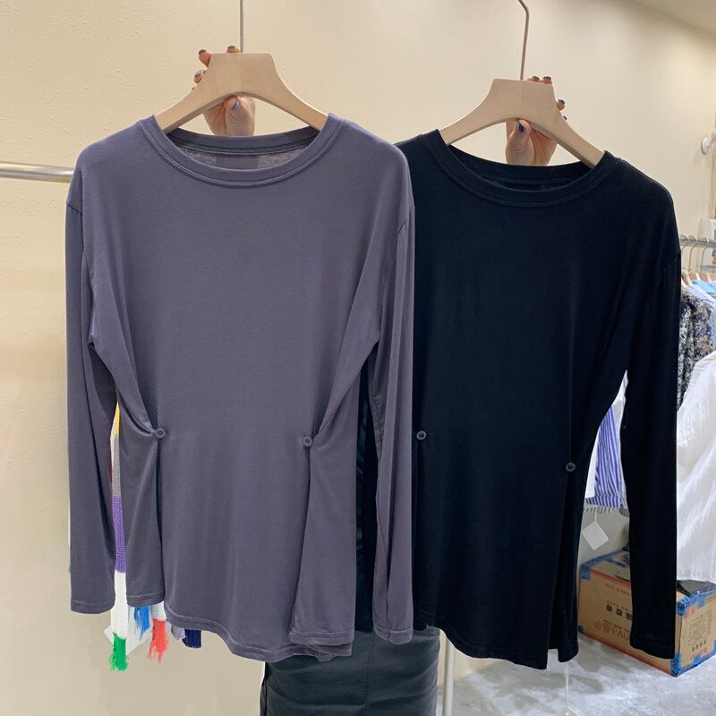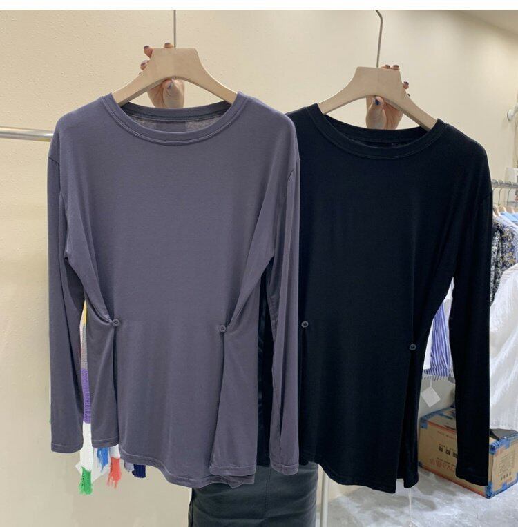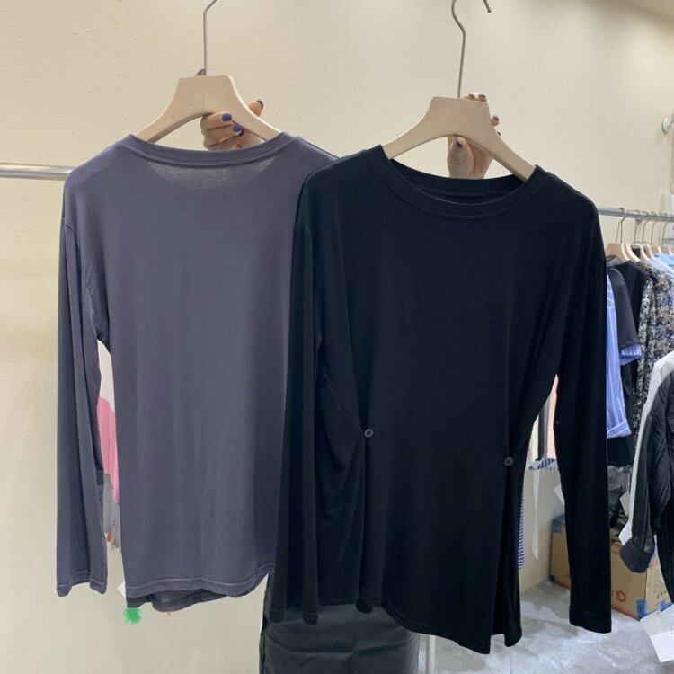 新品 ♡サイド★ボタンラウンドネックソリッド カラープルオーバー トップス ロング コットン ソリッドカラー ⦿韓国 オルチャン K-pop アイドル ジャケット スーツ ワンピース カーディガン ニット フーディー トレーナー キャミソール スカート シャツ ブラウス 5B9323048