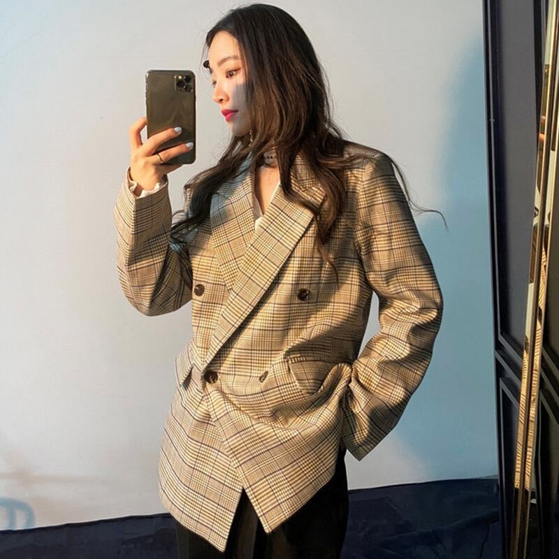 新品 スタンダードダブルブレストチェック柄ジャケット ベルト 大人女子☆ ロング レトロ ハーネス ⦿韓国 オルチャン K-pop アイドル ジャケット スーツ ワンピース カーディガン ニット フーディー トレーナー キャミソール スカート シャツ ブラウス 5A4871323