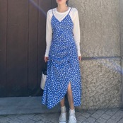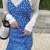 色:白いTシャツ,ブルーサスペンダースカートS,ブルーサスペンダースカートM
