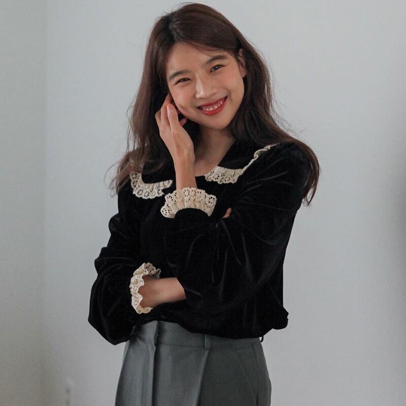 新品 レーストップス カジュアルベルベットシャツブラウス大人女子☆ ステッチ ⦿韓国 オルチャン K-pop アイドル ジャケット スーツ ワンピース カーディガン ニット フーディー トレーナー キャミソール スカート シャツ ブラウス 5A3575042 | K clothig adult