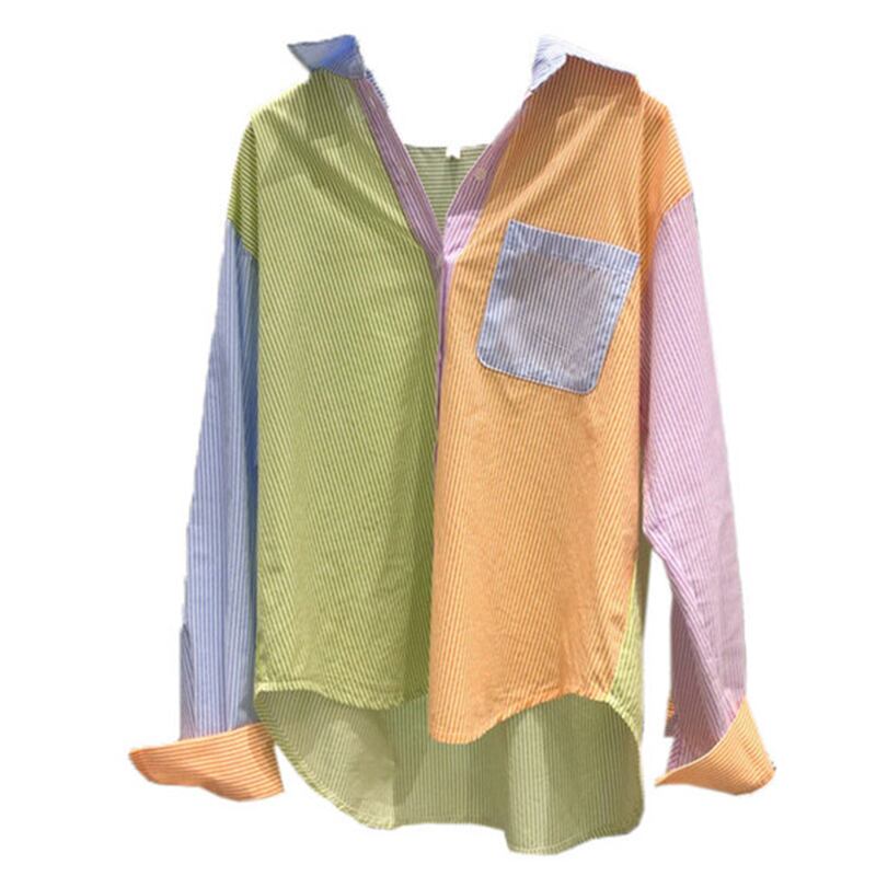 新品 カラーストライプシャツブラウスカジュアルトップス ロング ステッチ ⦿韓国 オルチャン K-pop アイドル ジャケット スーツ ワンピース カーディガン ニット フーディー トレーナー キャミソール スカート シャツ ブラウス 5B7379909 | K clothig adult