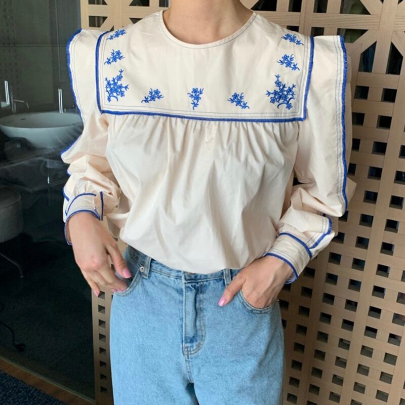 新品 スタンダード花柄刺繍ラウンドネックカラースリーブシャツブラウス レトロ ⦿韓国 オルチャン K-pop アイドル ジャケット スーツ ワンピース カーディガン ニット フーディー トレーナー キャミソール スカート シャツ ブラウス 5A4513600 | K clothig adult