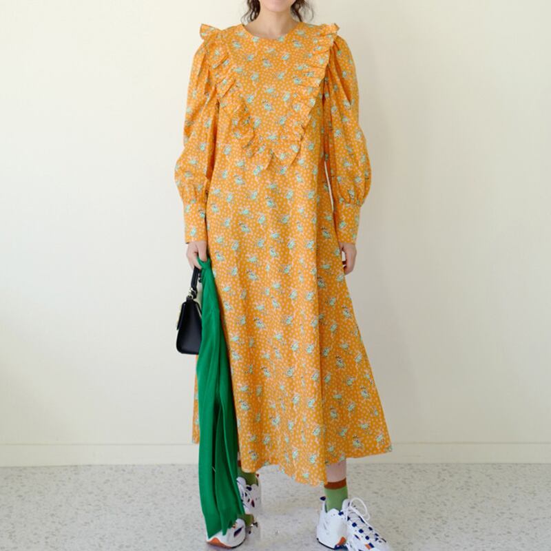 新品 花柄ラウンドネック膝丈 ひざ丈ロングスリーブ ランタンスリーブ スウィート ステッチ ⦿韓国 オルチャン K-pop アイドル ジャケット スーツ ワンピース カーディガン ニット フーディー トレーナー キャミソール スカート シャツ ブラウス 5A5531999