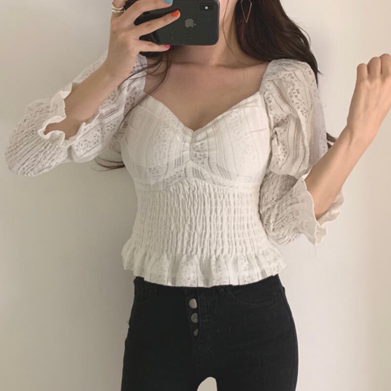 新品 ♥カワイイ♥スリム★ショートスリーブレースシャツブラウス スクウェア ⦿韓国 オルチャン K-pop アイドル ジャケット スーツ ワンピース カーディガン ニット フーディー トレーナー キャミソール スカート シャツ ブラウス 5A2840001