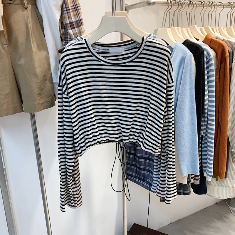新品 トップス ギャザーストライプ長袖スリーブTシャツ ロング ⦿韓国 オルチャン K-pop アイドル ジャケット スーツ ワンピース カーディガン ニット フーディー トレーナー キャミソール スカート シャツ ブラウス 5B8646652
