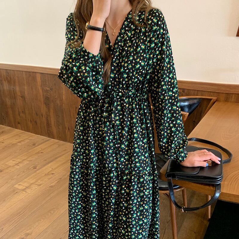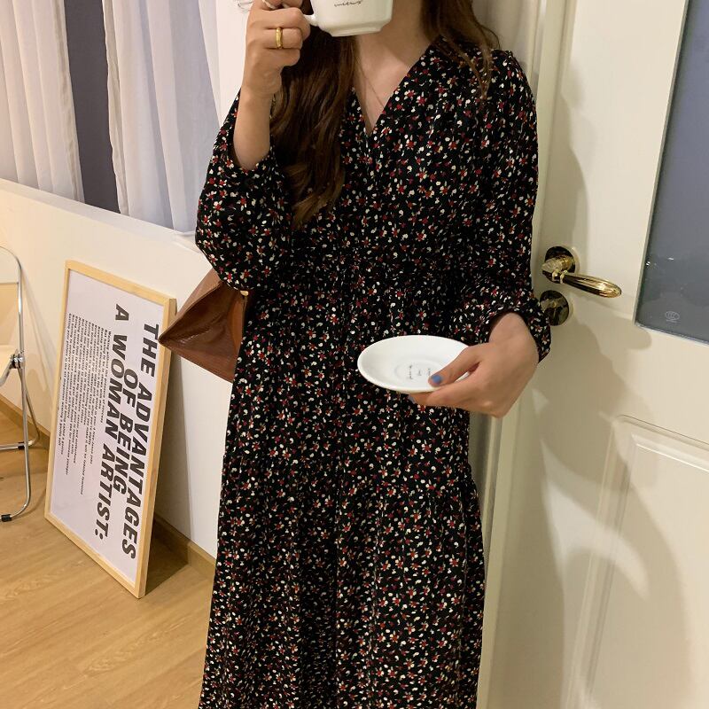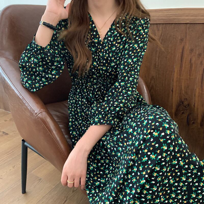 新品 スタンダード♥カワイイ♥Vネックギャザー★ロング大人女子☆ レトロ フラワーデザイン ⦿韓国 オルチャン K-pop アイドル ジャケット スーツ ワンピース カーディガン ニット フーディー トレーナー キャミソール スカート シャツ ブラウス 5A0378825 | K clothig adult